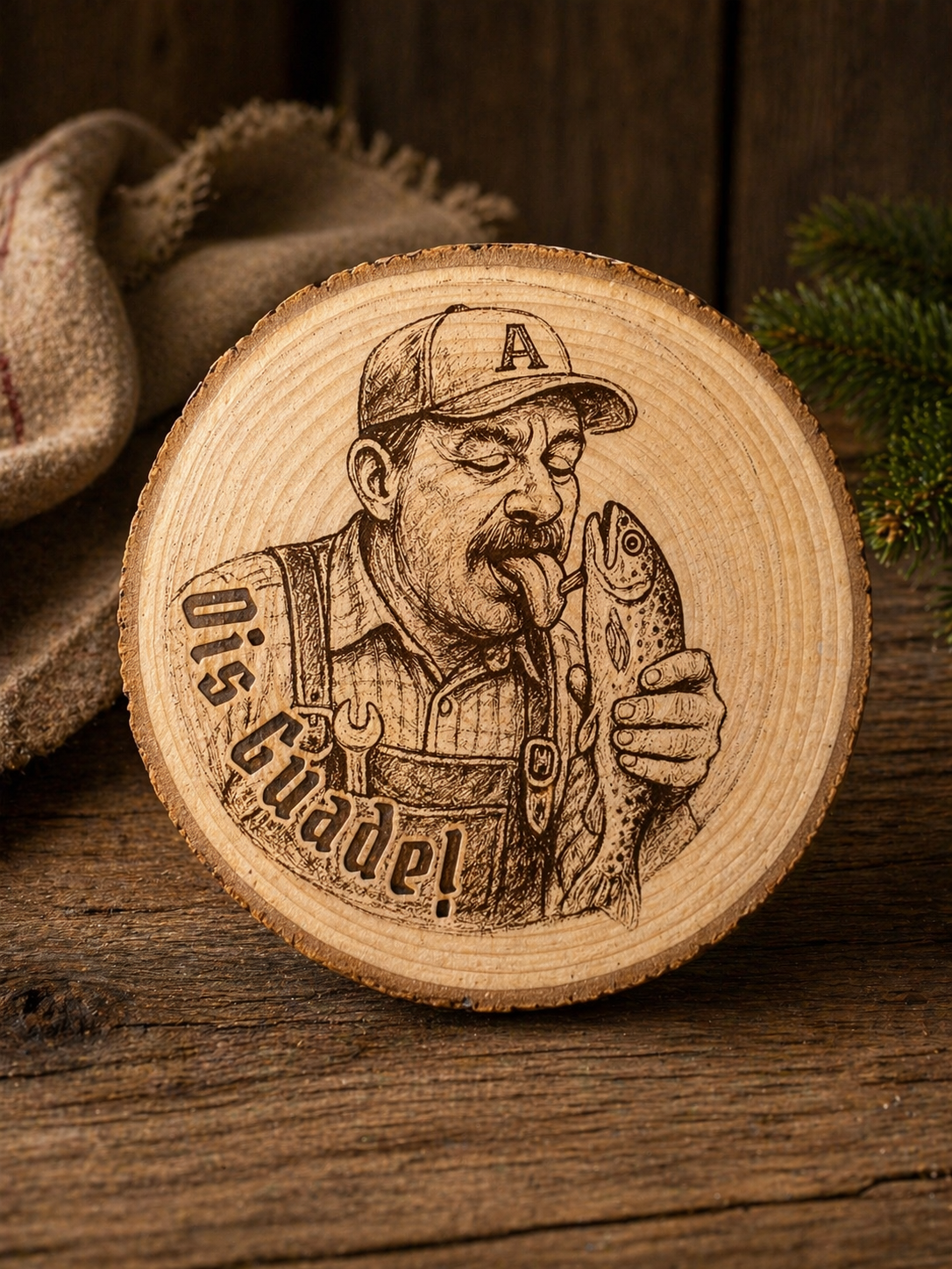 Individuell gravierte Holzscheibe als lustiges Geburtstagsgeschenk – mit bayerischem Humor und persönlichem Bezug.