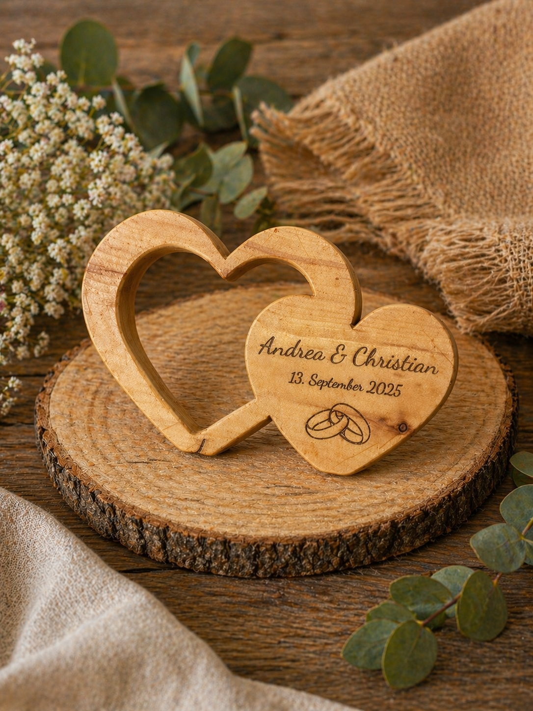 Individuell gefertigtes Herz aus Zirbenholz zur Hochzeit – mit Namen und Datum graviert. Ein natürliches Erinnerungsstück fürs Leben.