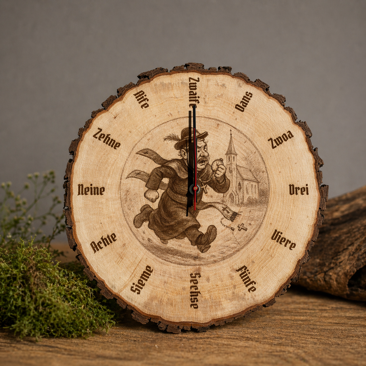 Individuell gefertigt nach Kundenwunsch – eine persönliche Holz-Uhr als besonderes Geschenk mit einzigartiger Gravur und Charakter.